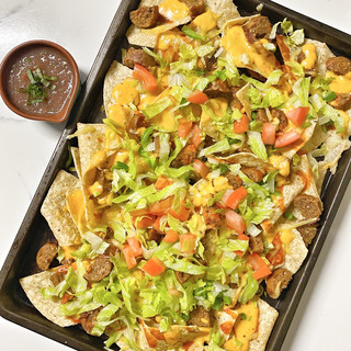Assemble your nachos. Put a base layer of tortilla chips, cholula, Kite Hill Queso, Brat slices, Violife Shreds and fresh jalapeños.