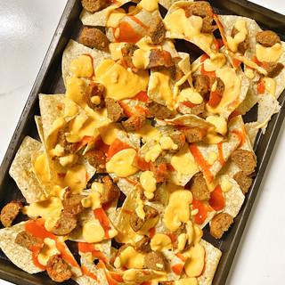 Now, I can't take all the credit for this yummy concoction. My fiancée, Rob (nickname, Bo) LOVES nachos and I suggested he make some to treat himself for dinner. So, in essence this was my idea 😉 BUT I will give him credit for making the kitchen smell like a movie theater back in the early 2000's. For this recipe, we used Beyond Meat "Brats", but we normally would use vegan chorizo. These are pretty scrumptious, sometimes we even just throw them on the grill. But on these nachos ... they were pretty tempting.