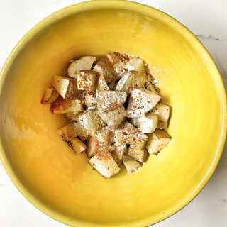 Chop large potatoes into twelfths (in half once, into fourths longways, and into thirds short ways). For small potatoes I recommend eighths so they aren't too small. Transfer into a medium size mixing bowl.
